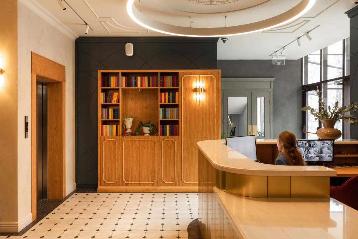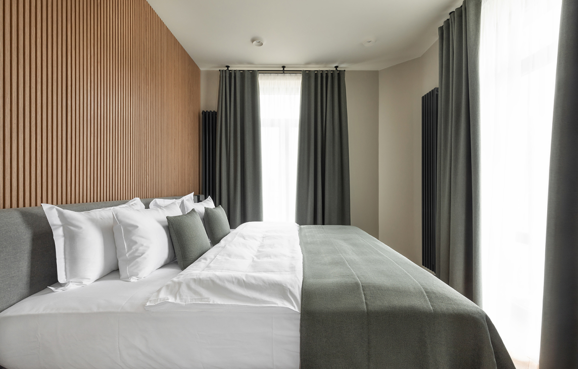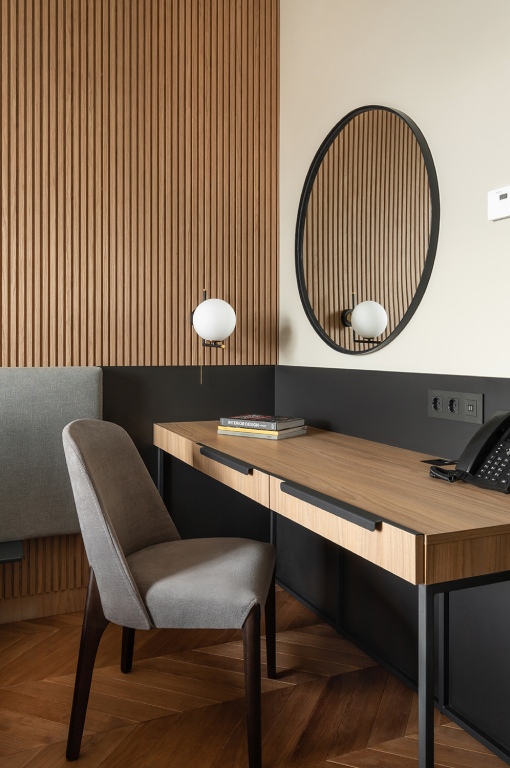Стриманий та елегантний інтер'єр, нейтральні кольори, дерев'яні фактури, ергономічний та функціональний простір сприяють фізичному й моральному відпочинку гостей.